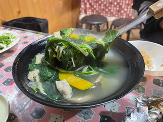 套餐附上的小米酒,被放置在剛好一口大小的手工竹杯內,餐前一飲而下,非常開胃。重口味的鹹豬肉以及甜度好的香蕉飯,接著一口清淡芋頭湯,在口中搭配在一起,完全不膩口,一回神已經掃的乾乾淨淨。