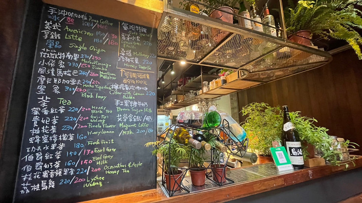 餐點菜單寫在吧台側面黑板上,輕食餐點都會搭配手作麵包和沙拉,雖然標題歸類輕食,份量當正餐是完全足夠的。飲品在正面的黑板,義式咖啡、精品手沖咖啡、茶、氣泡飲品都有,氣泡飲也可以特調有酒精版本!咖啡豆和茶葉都可以從罐子試聞,品項選擇很多。