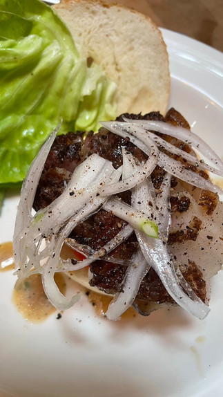前一次來訪時看到別桌在吃,肉餅一大顆看起來很像漢堡排,但口味並非一般的漢堡排,肉餅上有鯷魚和一個半熟蛋,最底下有薯泥和番茄湯,想要好吃完美一口的話可以剝下麵包一次沾取或在麵包放上所有的食材,但整個肉餅會倒榻,索性不管了整個麵包沾進去,反正都很好吃....!也不用擔心鯷魚有什麼腥味,因為鯷魚不是主體,所以並沒有放很多,但對整體的口味有個畫龍點睛的效果,香香鹹鹹的,當然番茄湯也要用麵包刷乾淨!